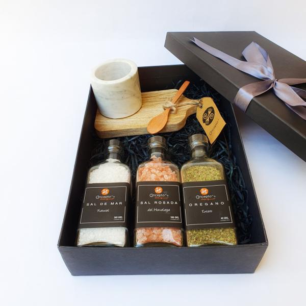 Caja Negra incluye 1 cuenco de mármol , 1 tablita de madera de mango 1 cucharita madera nativa mas 3 diferentes Condimentos o Sales Conceptomk Chile Gourmet