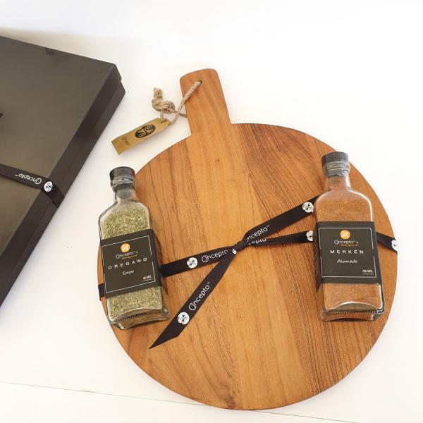 Caja Indian Salad, incluye 3 Cucharones diferentes formatos de madera de mango; 33 x 14, 28 x 5, 21 x 9 cm. Diferentes tipos de sales Conceptomk Chile Gourmet; 56 grs. Packing: Caja de cartón