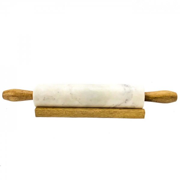 Maravilloso uslero de cocina de mármol blanco con asas de madera de Mango. Tiene el peso y la suavidad incluso para manejar las masas mas duras. Cuenta con una base de madera de Mango para sostenerlo.