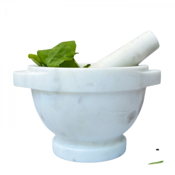Mortero Clásico en mármol blanco, especialmente para mezclar hierbas, condimentos, granos de pimienta, semillas y especies. Debido a que el mármol es un producto natural se producirán diferencias de v