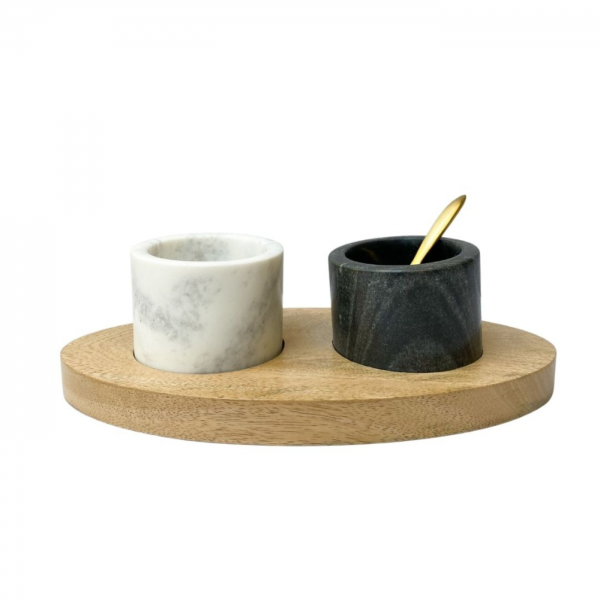 Bandeja de madera de mango con dos cuencos de mármol, uno blanco y otro negro. L: 22.86; W12.065 Bowl Size: 'ǿ 6.98 X H 5.08 Origen: India