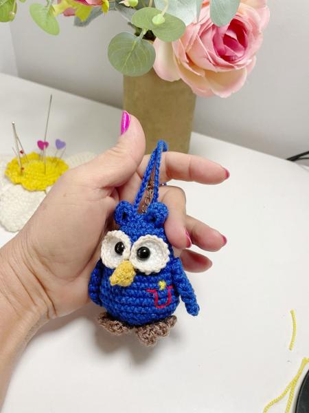 Hecho a mano con la tecnica de crochet. Hilo algodón, ojos con trava de seguridad, relleno fibra siliconada y argolla de llavero.