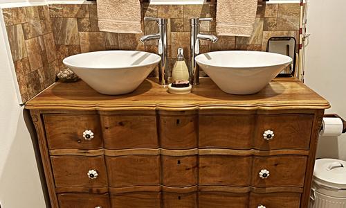 Cómoda antigua restaurada, estilo Normando, transformada en vanitorio doble.